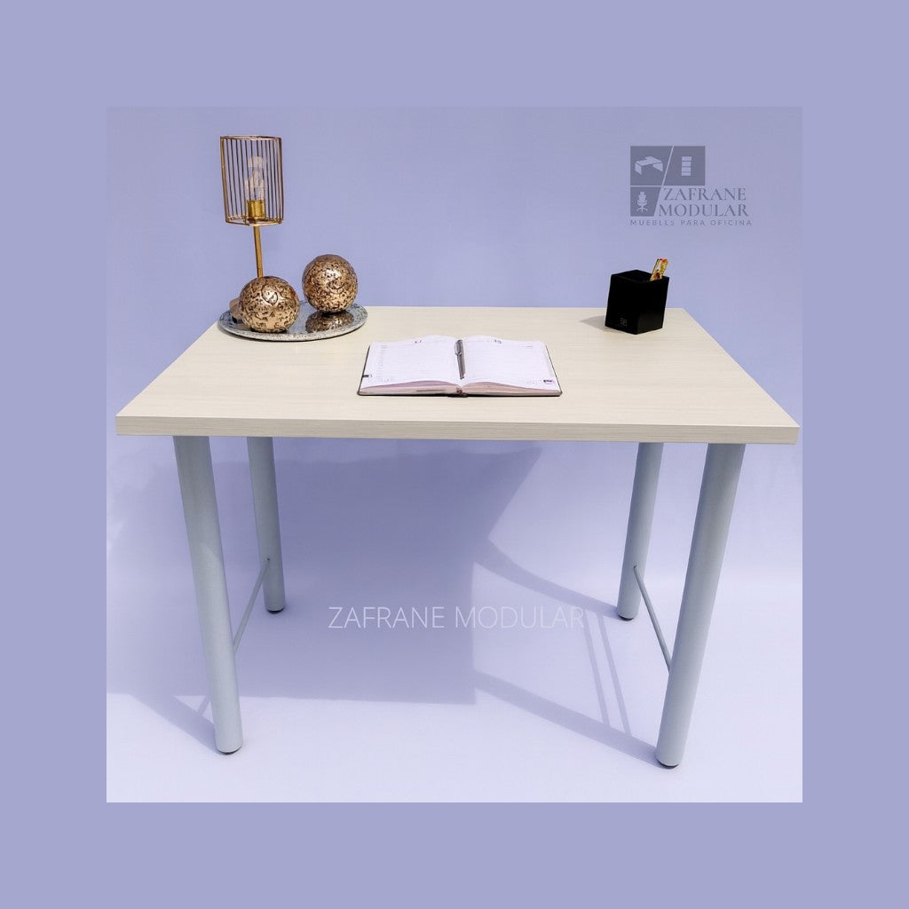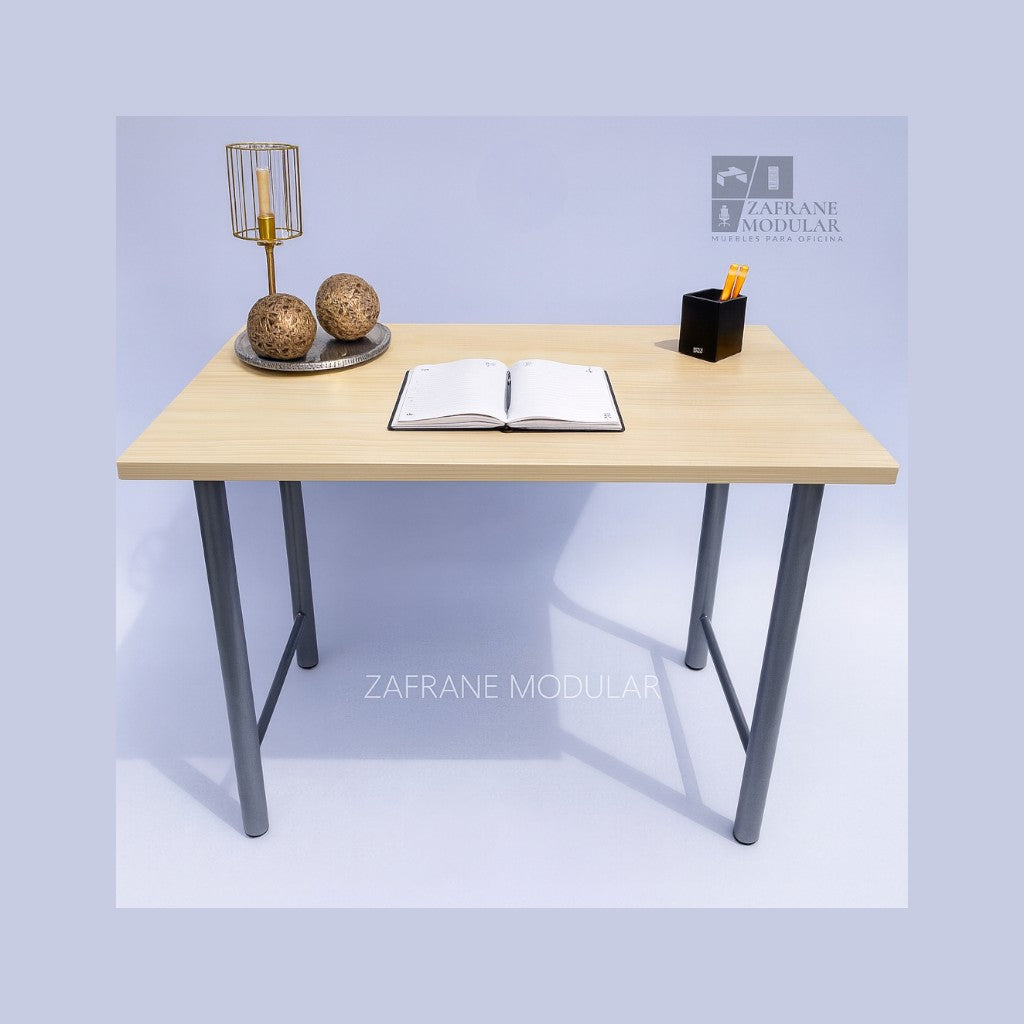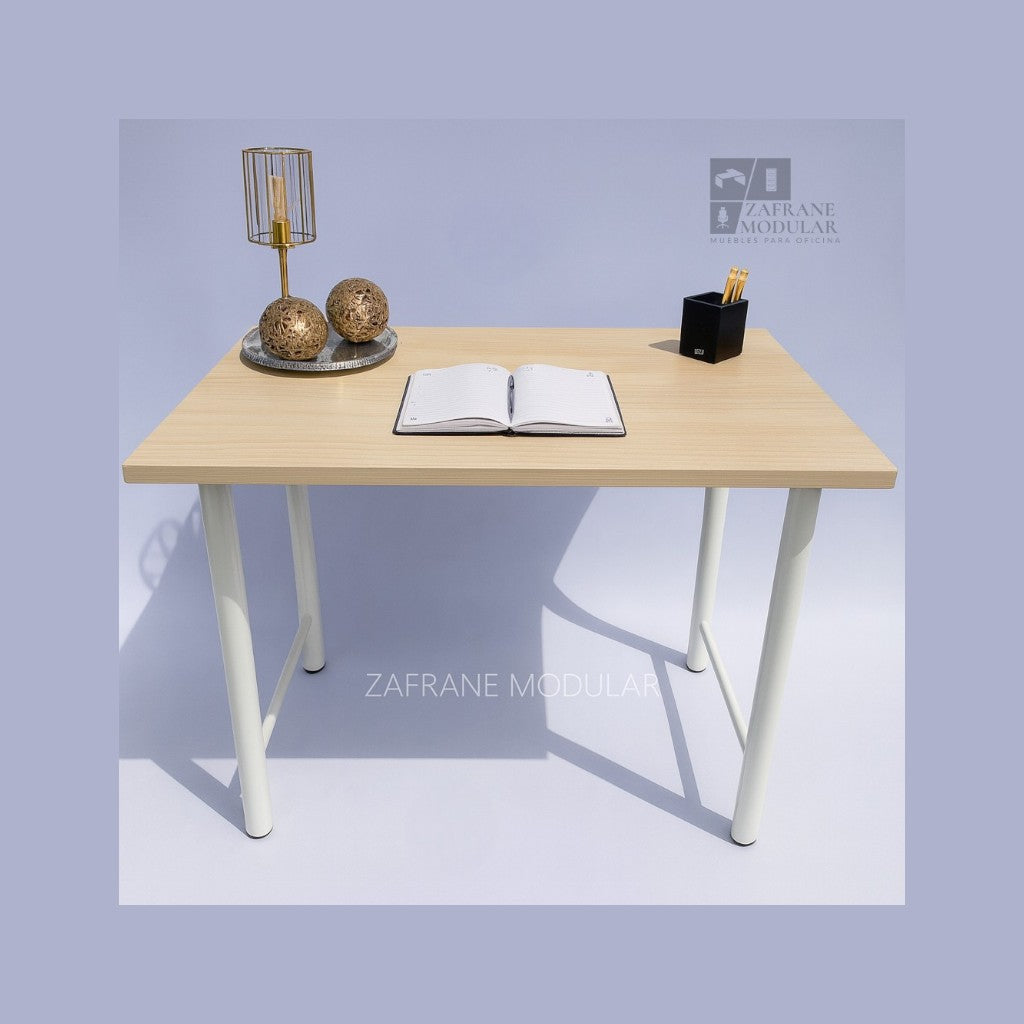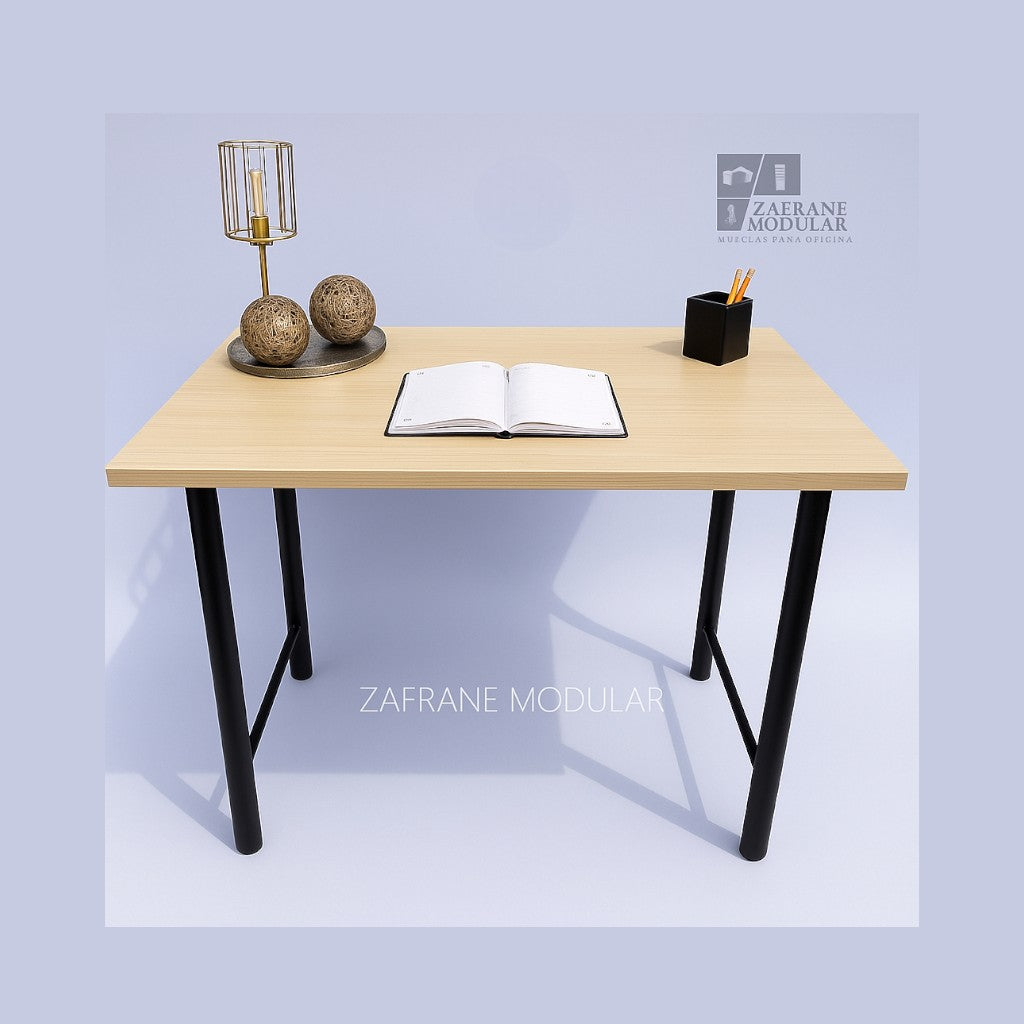 PRÁCTICO Y VERSÁTIL: Escritorio lineal de estilo moderno con soporte metálico en “U”, que combina firmeza y equilibrio visual. Su superficie en madera de acabado natural...
