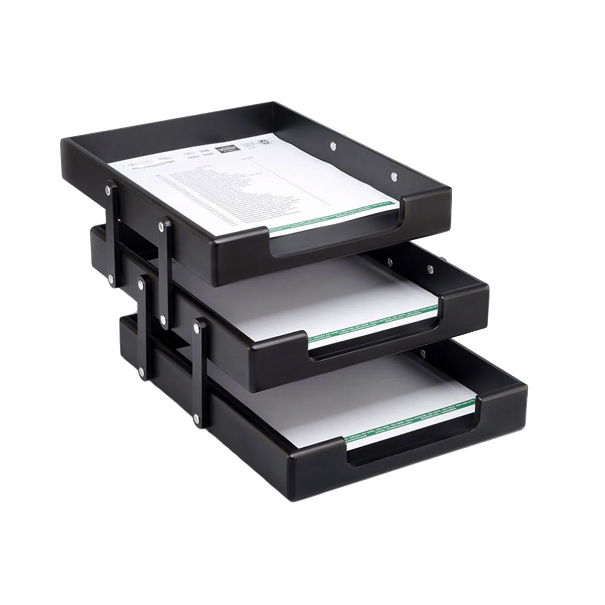 DISEÑO: Bandeja organizadora de 3 o 2 niveles con acabado en color negro. Su sistema articulado permite desplazar las bandejas una sobre otra para optimizar el espacio y mantener los documentos en orden.