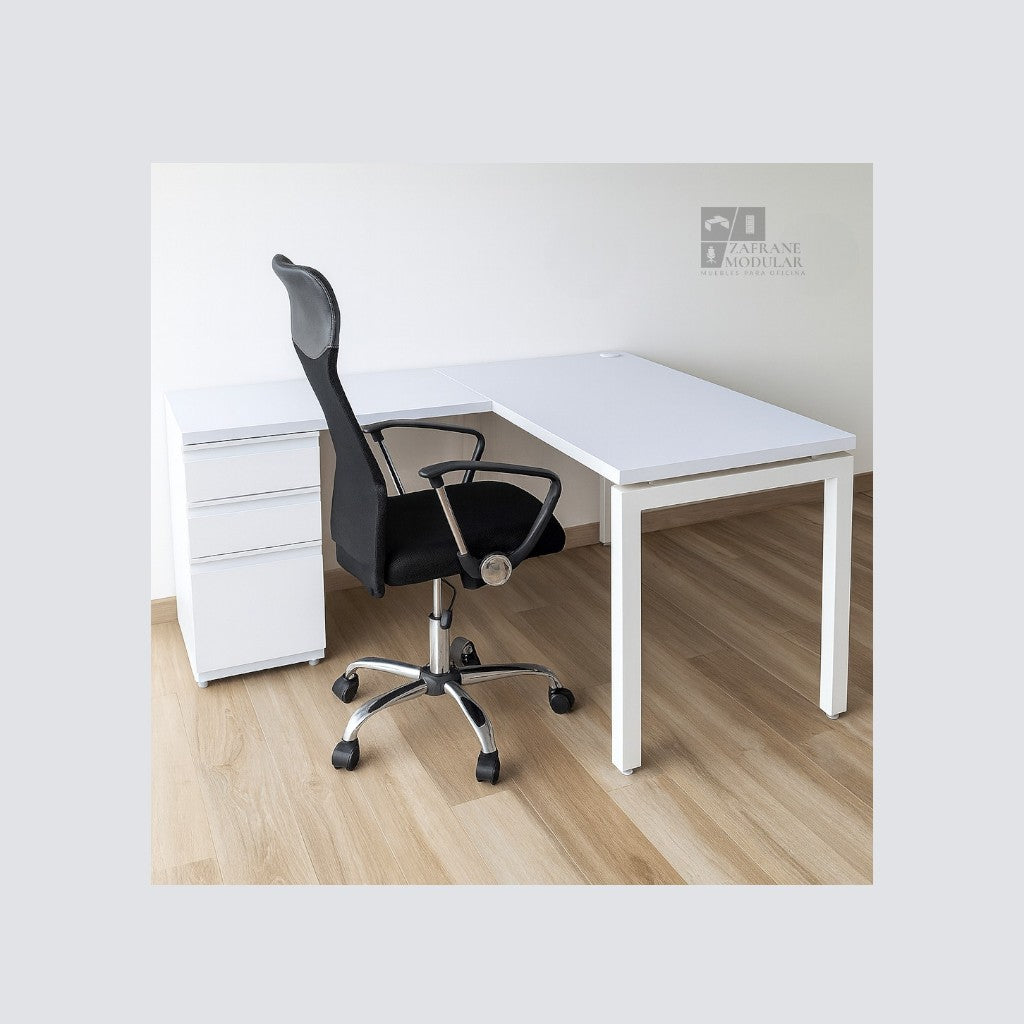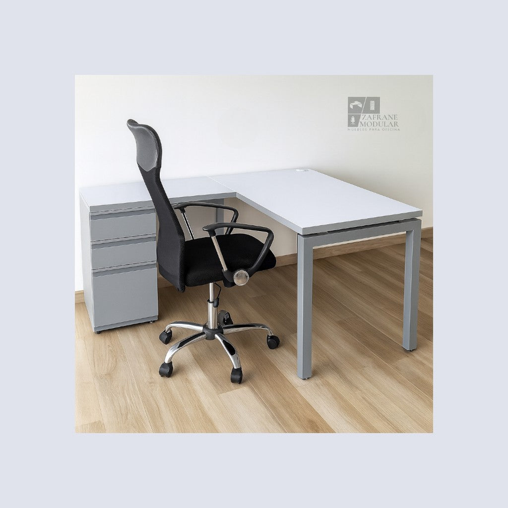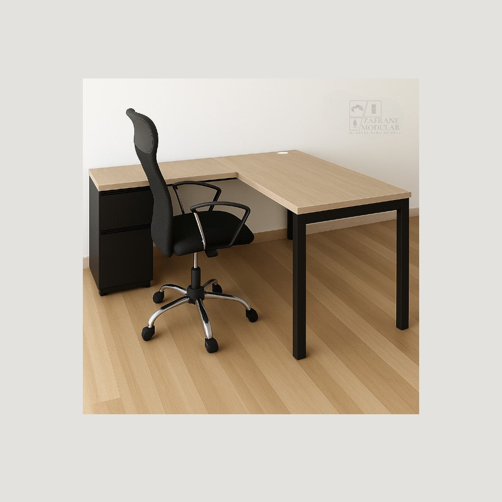 PRÁCTICO Y VERSÁTIL: Un escritorio en forma de “L” con soporte metálico en “U”, que combina resistencia y elegancia. Su estructura brinda firmeza y equilibrio, mientras que la superficie en madera ofrece una apariencia sobria y moderna. Ideal para entornos ejecutivos y espacios de trabajo amplios donde prima la organización y la durabilidad.