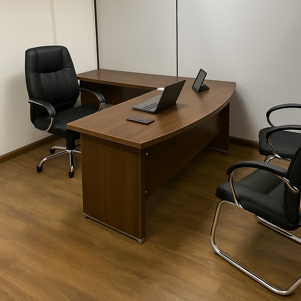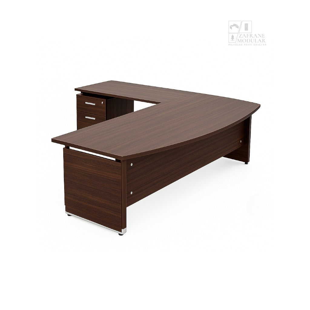 PRÁCTICO Y VERSÁTIL: Escritorio ejecutivo de alta presencia, elaborado en acabado madera para una apariencia sólida, cálida y profesional. Su diseño envolvente y líneas robustas proyectan liderazgo y sofisticación, creando un espacio gerencial imponente y funcional. Ideal para oficinas directivas que buscan personalidad, elegancia y máximo confort en su ambiente de trabajo.