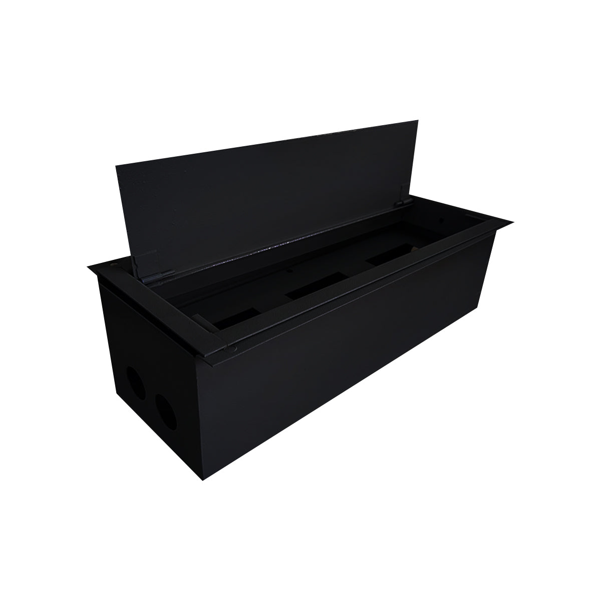 DISEÑO: Caja metálica con orificios para instalación de diferentes tipos de puertos de conexión. Su estructura robusta y compacta permite integrar soluciones eléctricas, de voz y datos en estaciones de trabajo modernas, optimizando el orden y la funcionalidad en el escritorio.